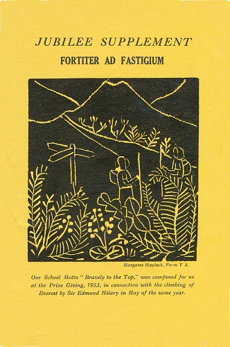 The Service was followed by tea at the School by invitation of Dr Tilly, for which the Hall was beautifully decorated, and at which a special Jubilee Cake appeared, bearing the new School Crest, and wearing a "hat-band" in the School Colours. It had been made by Miss Johnson.